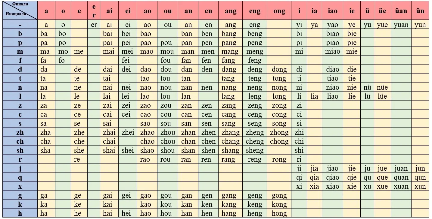 Ниже приведём таблицу пиньиня и сочетаемости инициалей и финалей в китайском: